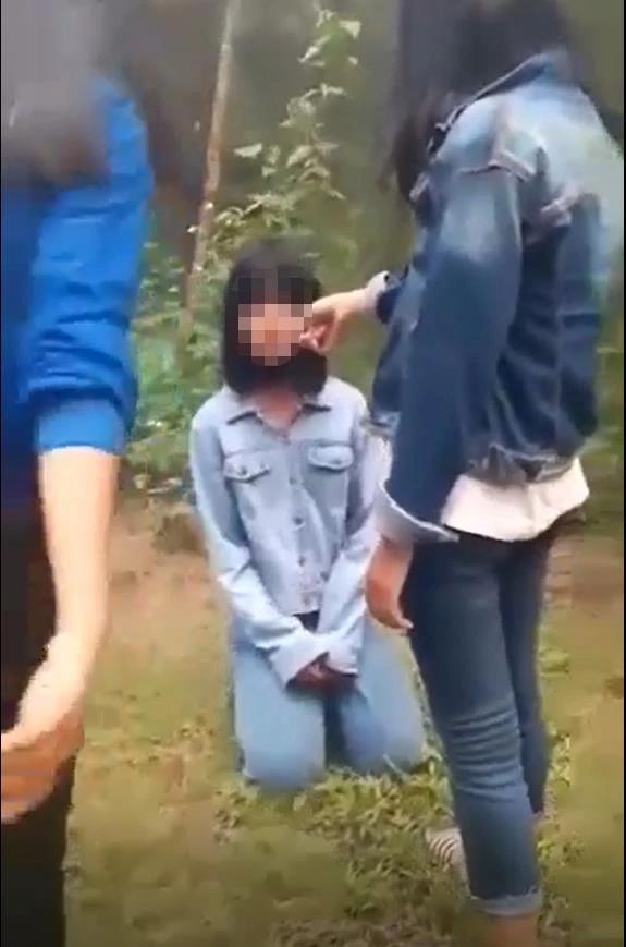 Em T. bị nhóm học sinh lớp bắt quỳ xuống đất.