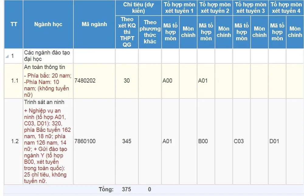 Đối với nhóm ngành Nghiệp vụ an ninh (tổ hợp A01 chiếm 30%, tổ hợp D01 chiếm 30%, tổ hợp C03 chiếm 40% tổng chỉ tiêu được giao theo vùng tuyển sinh phía Bắc hoặc phía Nam theo đối tượng nam hoặc nữ).