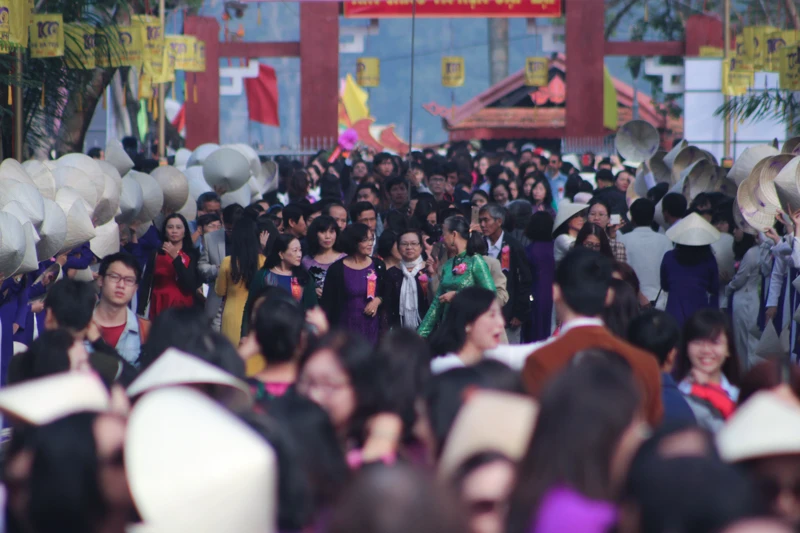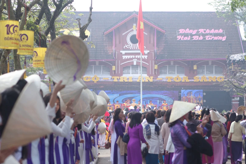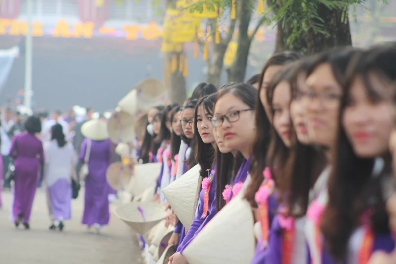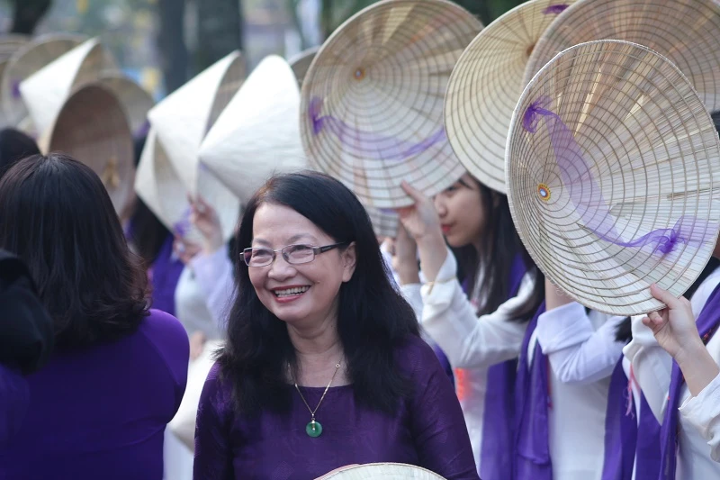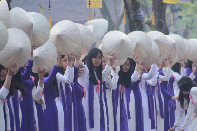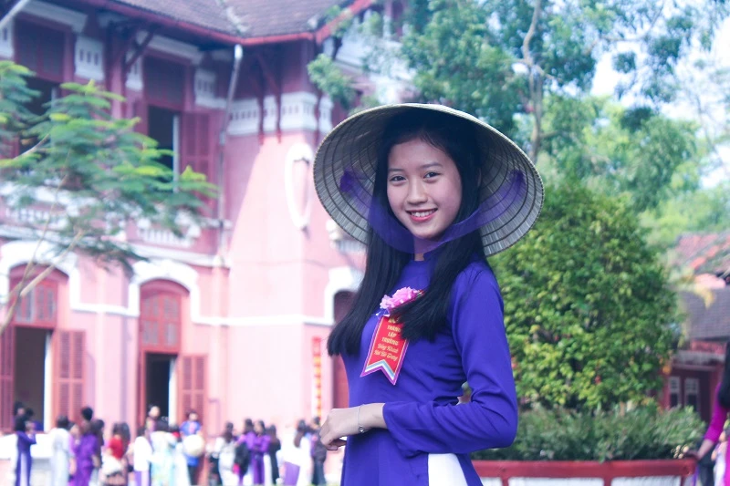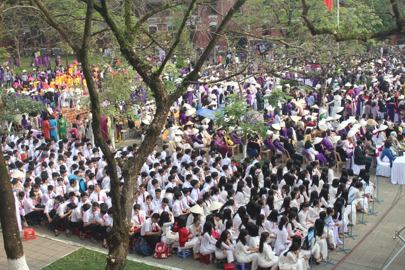 Trong ngày kỷ niệm 100 năm thành lập, ngay từ sáng sớm, các em học sinh trong trang phục áo dài trắng và tím chào đón những thế hệ học sinh của trường quay về thăm trường trong ngày kỷ niệm.