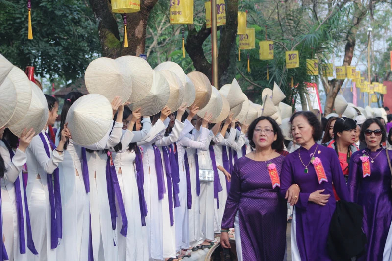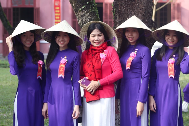 Cô trò trong trang phục áo dài tím và trắng.