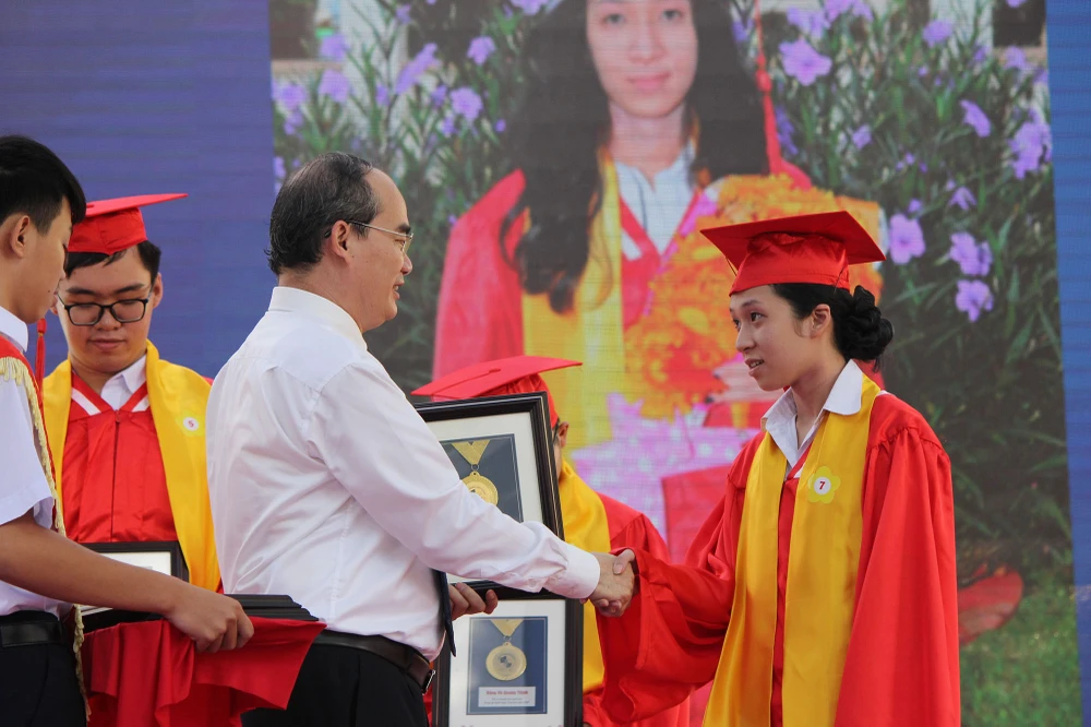 Bí thư Thành ủy TP HCM Nguyễn Thiện Nhân tặng bằng khen cho các em học sinh đạt thành tích cao trong các kỳ thi.