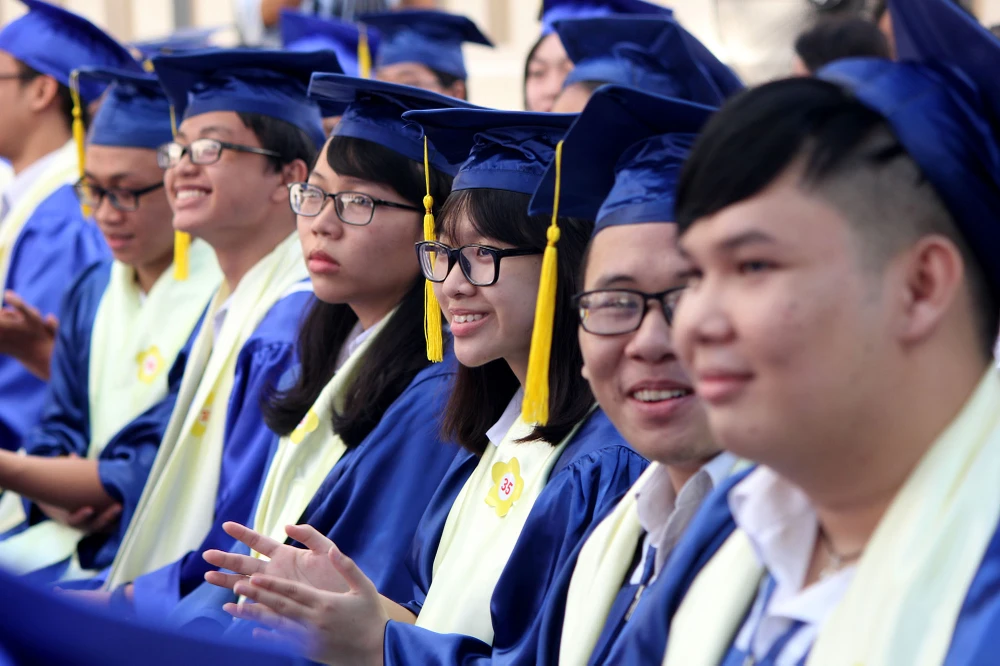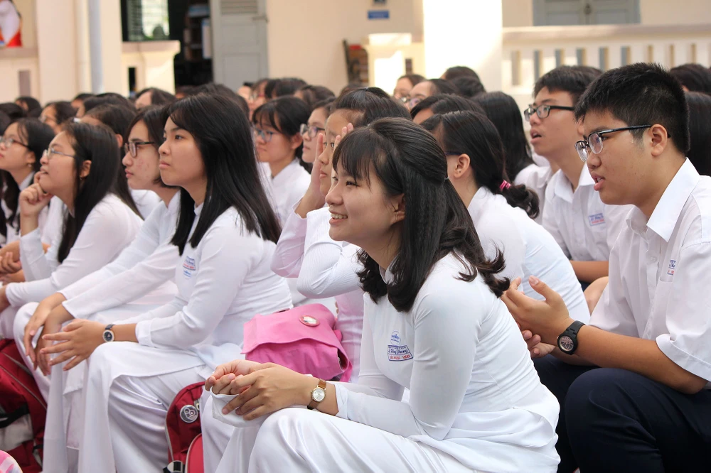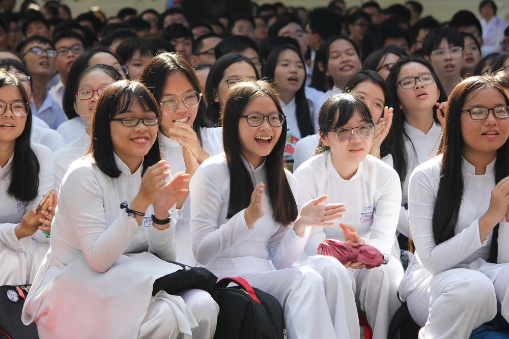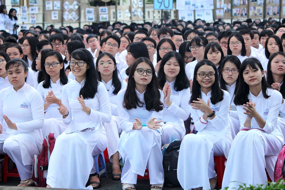 Các nữ sinh trong tà áo dài trắng rạng rỡ trong lễ khai giảng.