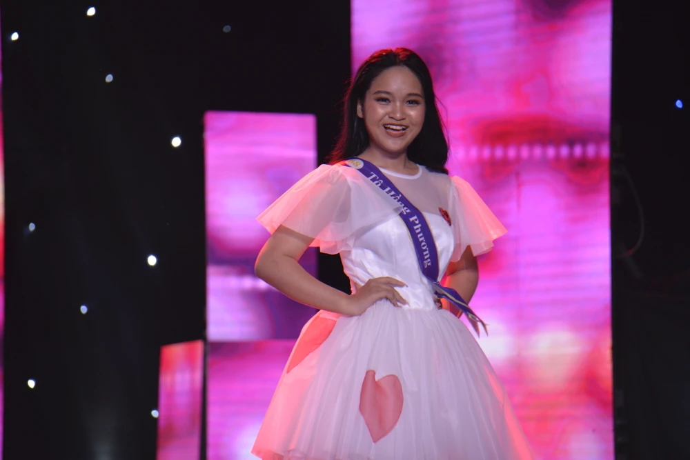 Cô bé mồ côi sải bước tự tin trong đêm chung kết. Ảnh: NGUYỄN TRÀ