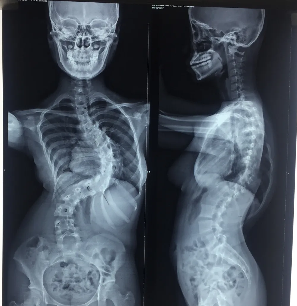 Kết quả chụp phim X-quang cho thấy cột sống của nữ sinh cong vẹo lớn. Ảnh: H.LAN