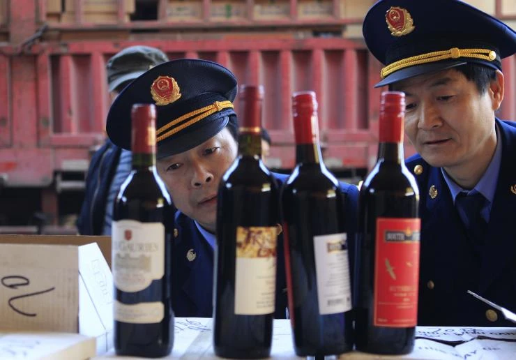 Cảnh sát Trung Quốc đang kiểm tra những chai rượu giả bị tịch thu trước khi đem chúng đi tiêu hủy tại Tây An – tỉnh Thiểm Tây – Trung Quốc