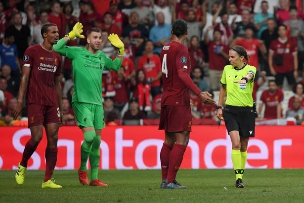Stephanie Frappart chỉ tay vào chấm 11m sau pha phạm lỗi của thủ thành Adrian. ẢNH: UEFA