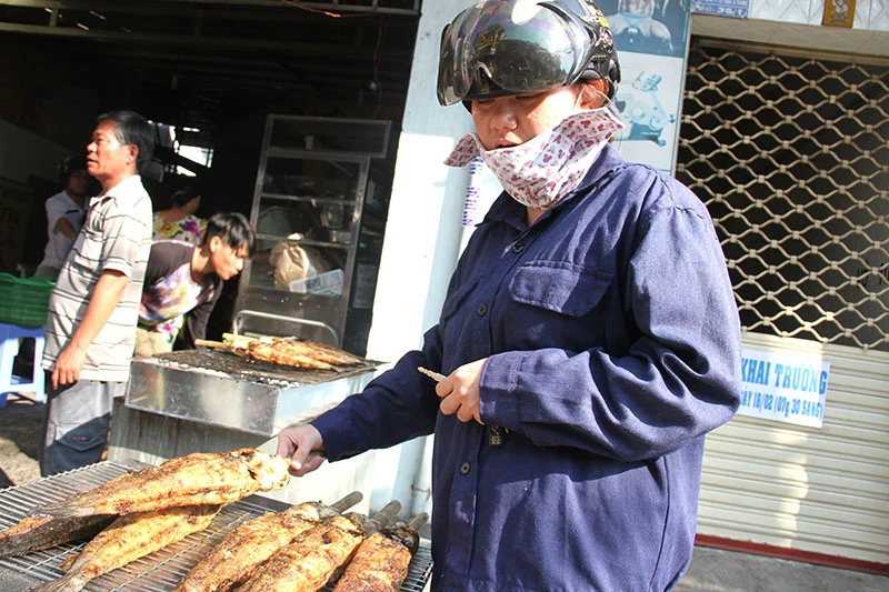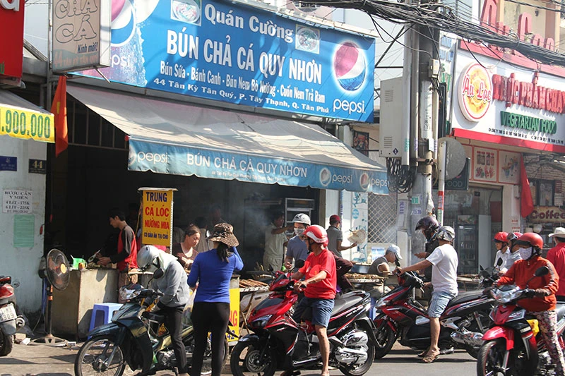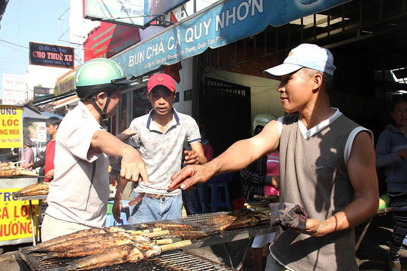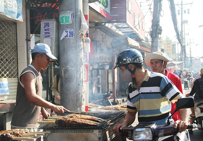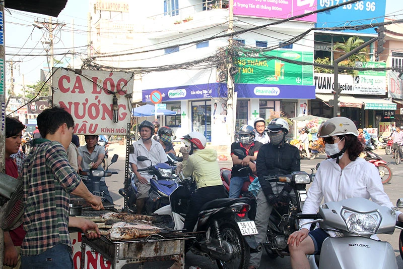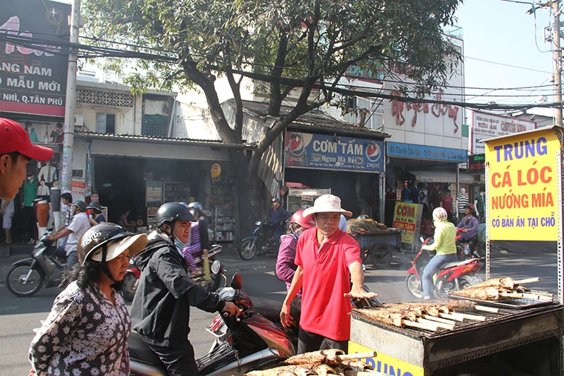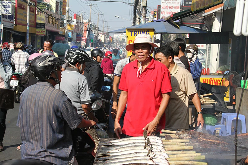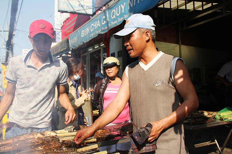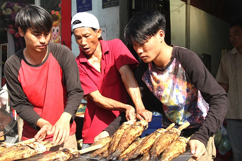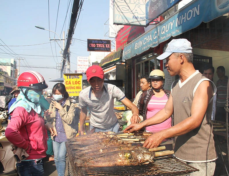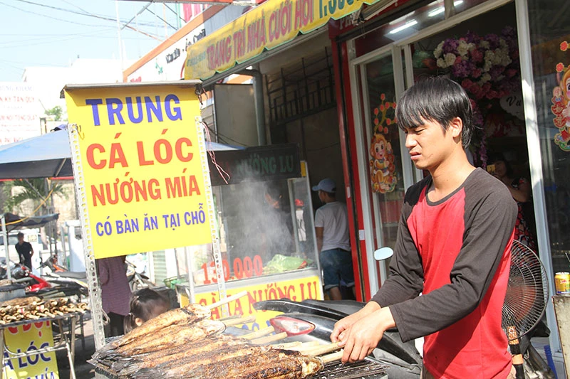 Đến 8 giờ sáng nay, nhiều cửa hàng bán cá lóc nướng trên đường Tân Kỳ Tân Quý đã chật kín người mua, nhiều nơi phải tăng cường thêm người nướng cá và người bán, mỗi người một việc mới phục vụ tốt được. Ngoài ra, nhiều cửa hàng được mở thêm để phục vụ nhu cầu của người dân.