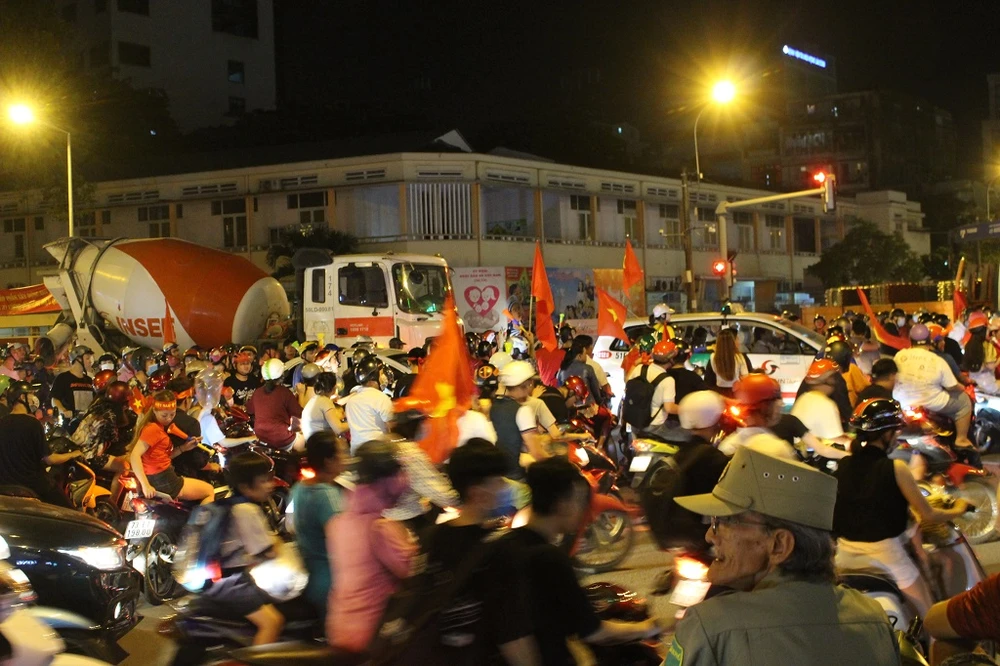 Dòng người vẫn không ngừng di chuyển đến khu vực này, thổi còi, hô hào chiến thắng của đội tuyển Việt Nam. Không khí vẫn chưa ngớt náo nhiệt.