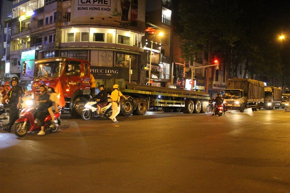 Dù đã lập rào chắn phân luồng, ngăn không cho dòng người đổ về quận 1, nhưng giao thông trên đường Nguyễn Thái Học vẫn phức tạp vì đến giờ xe tải, container vào nội thành.