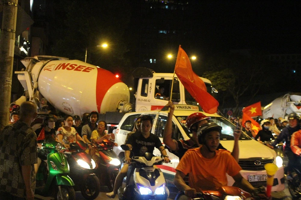 Xe bồn, xe tải, bị kẹt trong dòng người đổ xuống đường ăn mừng chiến thắng của đội tuyển Việt Nam tại khu vực quận 1. Ảnh: L. THOA