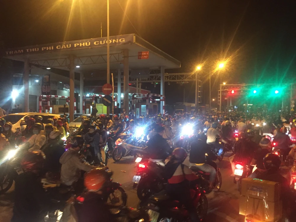 Đến 22 giờ 30 ngày 29-4, hàng ngàn phương tiện đang kẹt cứng, kéo dài hàng chục cây số trên tuyến đường qua cầu Phú Cường, nối TP.HCM và Bình Dương.