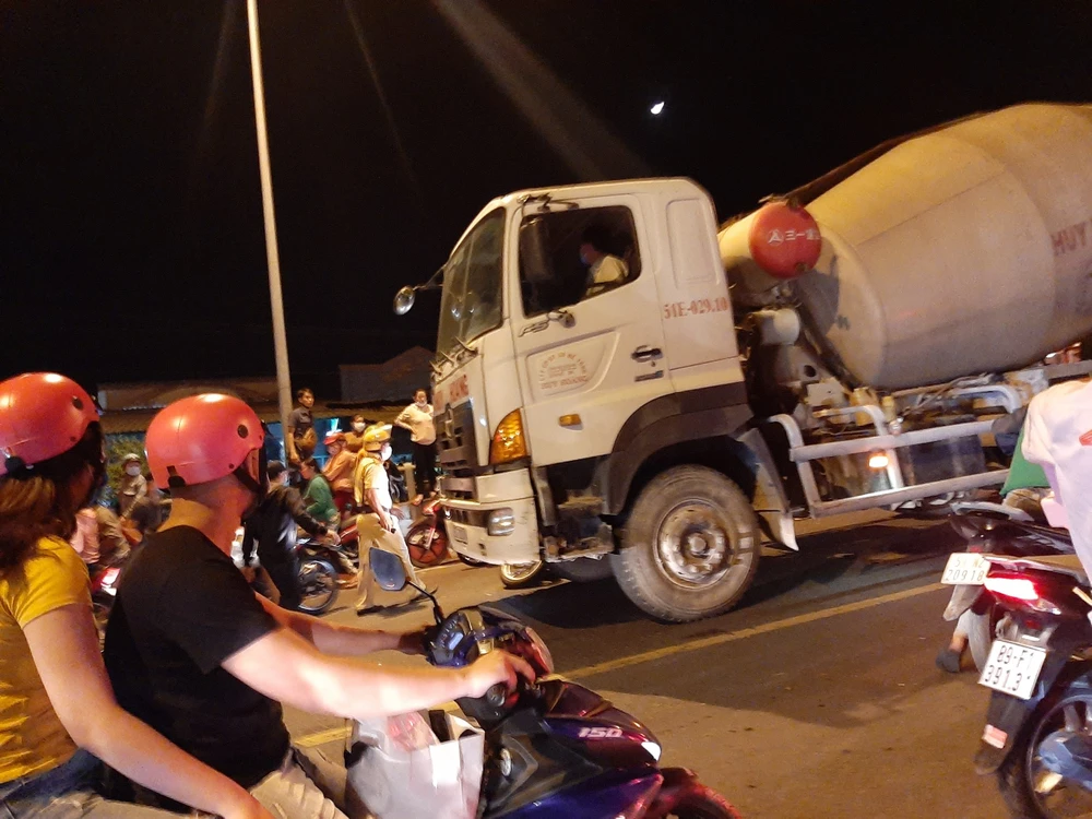 Vì chen chúc quá đông nên một chiếc xe máy bị ngã và bị chiếc xe bồn cuốn vào gầm. Ảnh: LÊ ÁNH