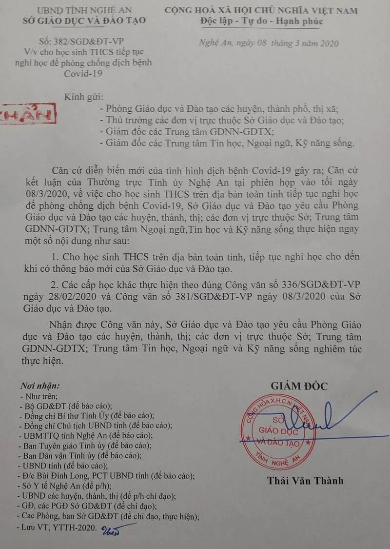 Khuya 8-3, sau khi Thường trực Tỉnh ủy Nghệ An kết thúc phiên họp và căn cứ diễn biến mới của tình hình dịch bệnh COVID-19 gây ra, Sở GD&ĐT tỉnh Nghệ An có Công văn số 382 chỉ đạo: “Cho học sinh THCS trên địa bàn toàn tỉnh, tiếp tục nghỉ học cho đến khi có thông báo mới của Sở GD&ĐT”.