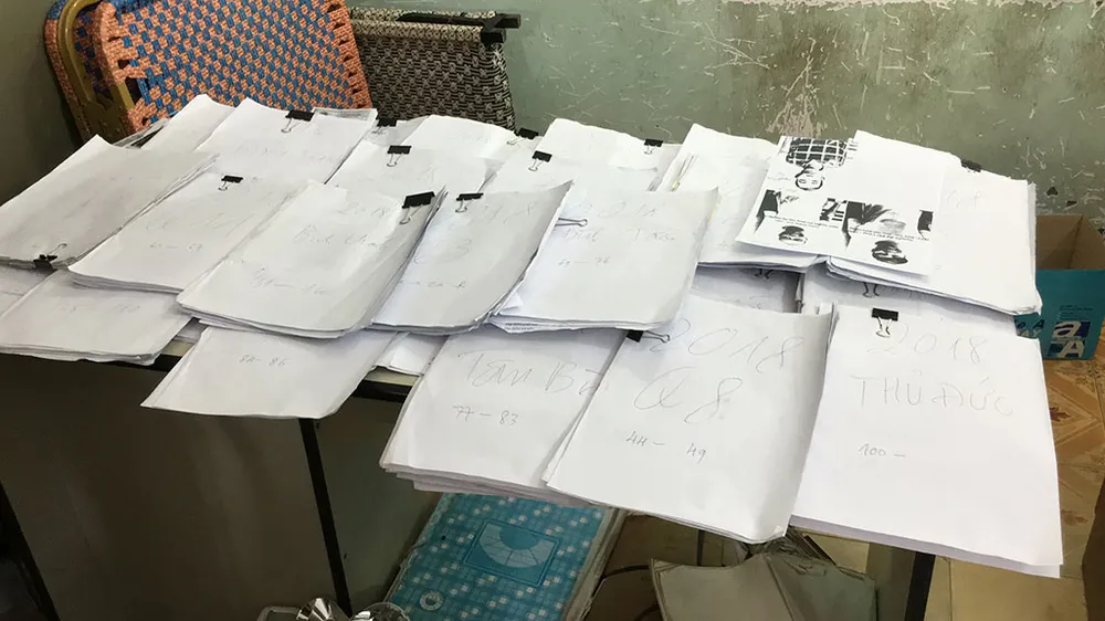 Khối lượng lớn hồ sơ của những "con nợ" mà cảnh sát phát hiện. Ảnh: NT