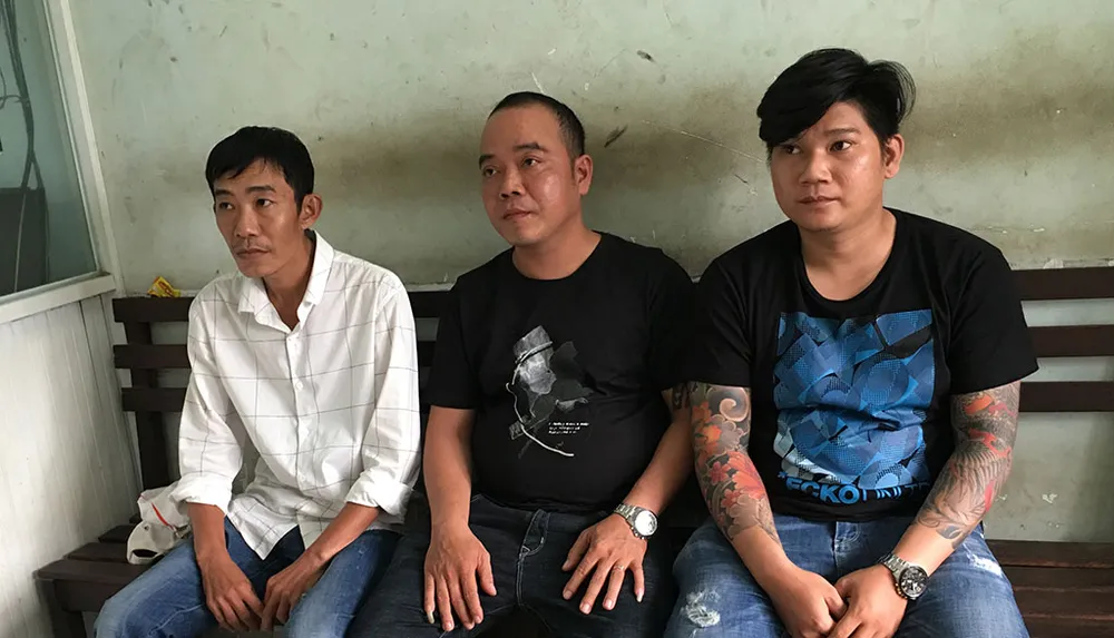 Công (bên phải, ngoài cùng), Anh (ở giữa) và Tín tại cơ quan điều tra. Ảnh: NT