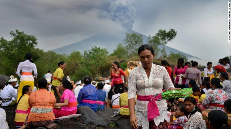 Người dân Bali tu tập cầu nguyện gần núi Agung với hy vọng ngăn ngừa một vụ phun trào nữa. Ảnh: CNN
