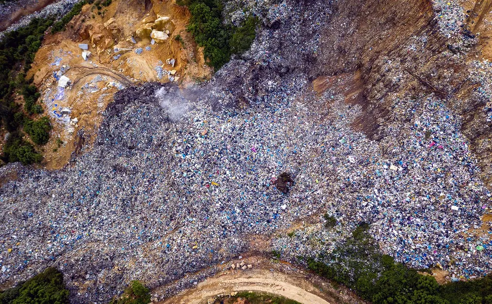 Từ dưới chân đồi nhìn lên, khối rác đổ thẳng xuống như dòng suối đang chảy len lỏi theo những rãnh đất bị trượt trôi.