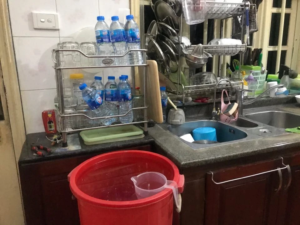 Khi phát hiện nước có mùi lạ, ga đình chị Lê phải mua nước khoáng về đổ vào xô lớn để ăn uống, nấu cơm. Ảnh: AH