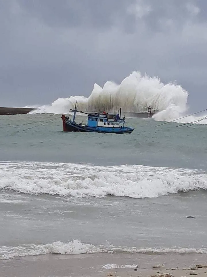 Tại cảng Phú Quý, nước đang dâng nhanh và kèm theo sóng lớn. Đến thời điểm hiện tại, các tàu thuyền vẫn tương đối an toàn do người dân đã neo đậu, chằng chống kỹ càng.