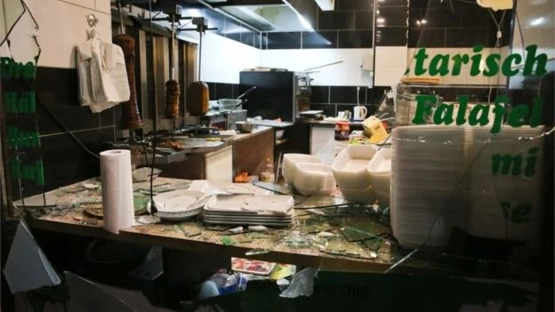 Cửa sổ nhà hàng bánh Kebab bị vỡ sau cuộc tuần hành của nhóm Pegida tại Leipzip. (Ảnh: AP)