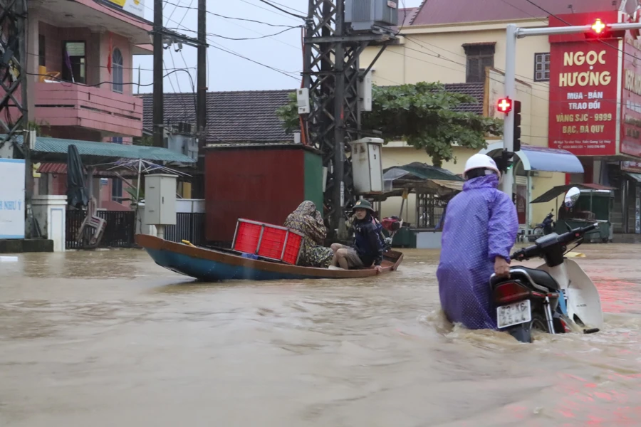 Nhiều nơi ở huyện Lệ Thủy (Quảng Bình) nước lũ dâng cao, xe máy bị ngập nước, người dân sử dụng thuyền để đi lại. Ảnh: ND