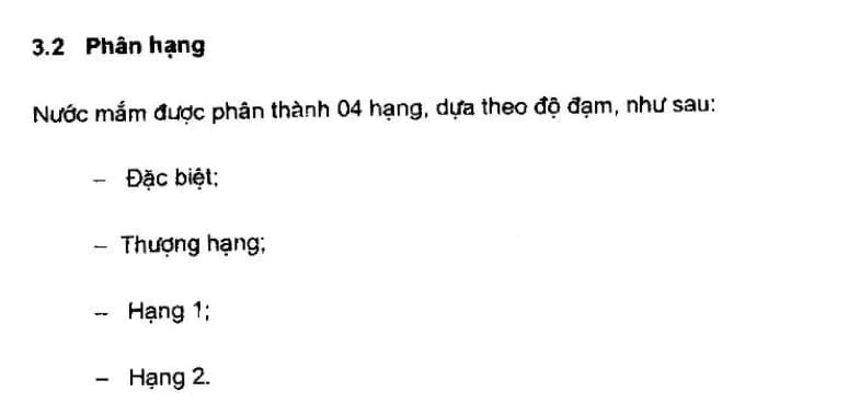 Theo đó, nước mắm được phân hạng thành bốn loại: đặc biệt, thượng hạng, hạng 1, hạng 2.