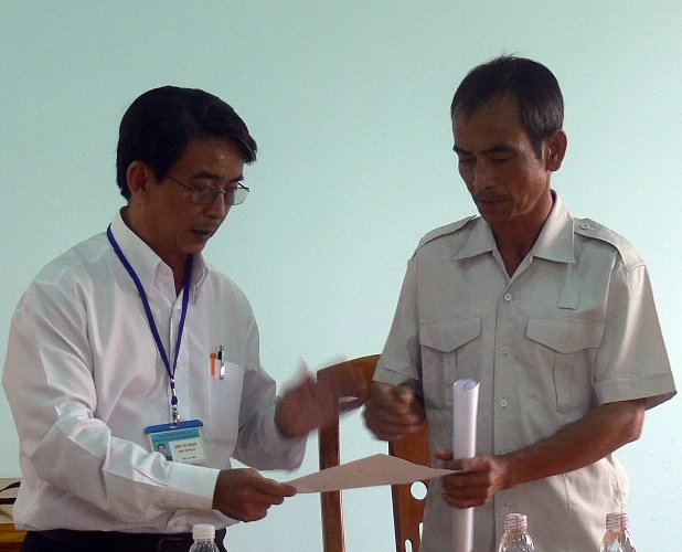 Ông Biện Văn Hoan, Phó Chánh án TAND tỉnh Bình Thuận, hướng dẫn ông Nén làm đơn yêu cầu bồi thường oan. ảNH: PHƯƠNG NAM