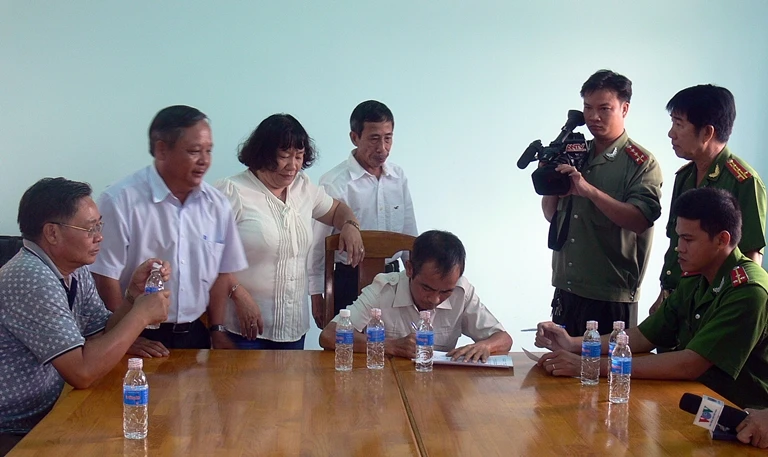 Không khí buổi công bố trở nên nhẹ nhàng hơn khi ông phó viện trưởng VKSND tỉnh Bình Thuận tươi cười đến bắt tay chia sẻ với ông Nén và ông Biện Văn Hoan, Phó Chánh án TAND tỉnh Bình Thuận, thân mật hướng dẫn tỉ mỉ cho ông Nén làm đơn yêu cầu bồi thường oan.
