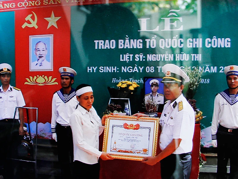 “Hôm qua, Lữ đoàn tàu ngầm 189 đã đại diện đơn vị về trao bằng Tổ quốc ghi công, ai cũng thương nó. Giờ nó đã là liệt sĩ rồi, nó không còn nữa nhưng những gì nó cống hiến được Tổ quốc ghi công, tôi hãnh diện vì nó” - bà Minh vừa nói vừa quay sang nhìn con dâu rồi bà nhìn về phía di ảnh con trai-liệt sĩ Nguyễn Hữu Thi và tấm bằng Tổ quốc ghi công mà gia đình vừa nhận được.