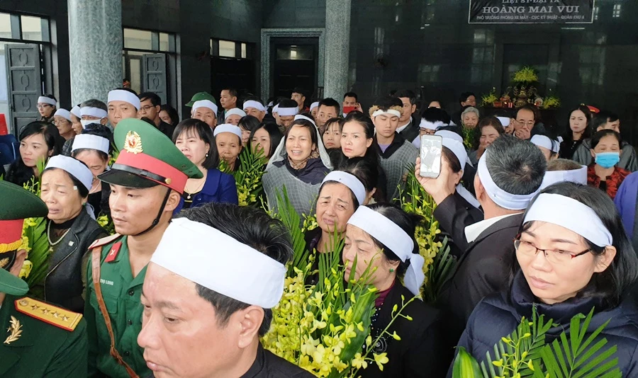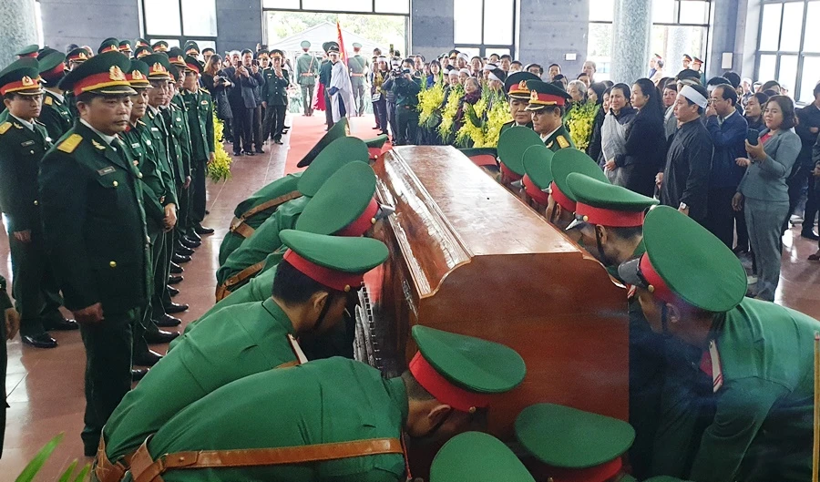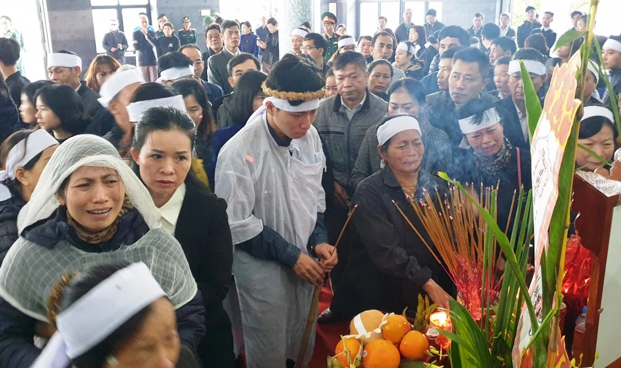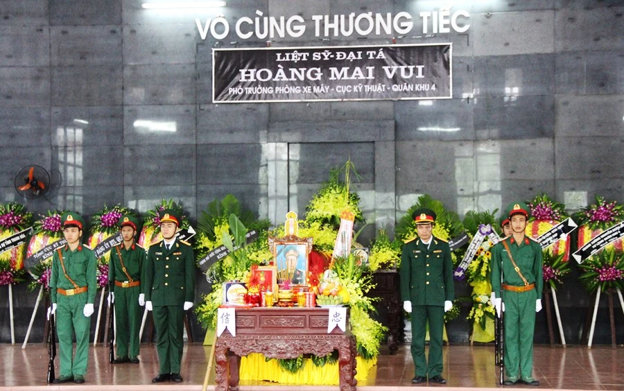 Sáng 19-10, Lễ viếng liệt sỹ, Đại tá Hoàng Mai Vui, Phó Trưởng phòng Xe máy, Cục Kỹ thuật Quân khu 4 được tổ chức trang trọng tại Nhà tang lễ của tỉnh Thanh Hóa. Đại tá Hoàng Mai Vui là 1 trong 13 liệt sĩ hy sinh trong khi làm nhiệm vụ cứu hộ, cứu nạn 16 công nhân mất tích ở thủy điện Rào Trăng 3 (Thừa Thiên Huế). Ảnh: ĐẶNG TRUNG