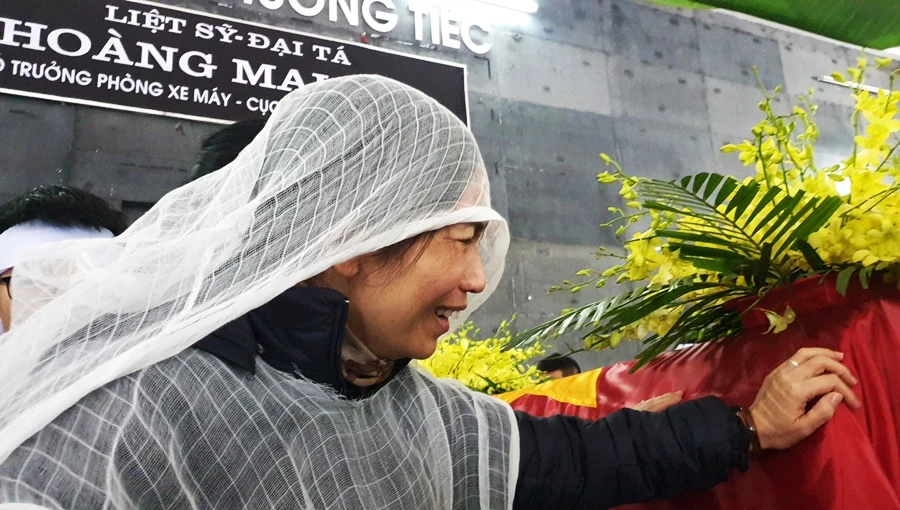 Vợ Đại tá Hoàng Mai Vui, chị Tống Lê Mỹ Linh đớn đau chạm vào quan tài. Ảnh: ĐẶNG TRUNG