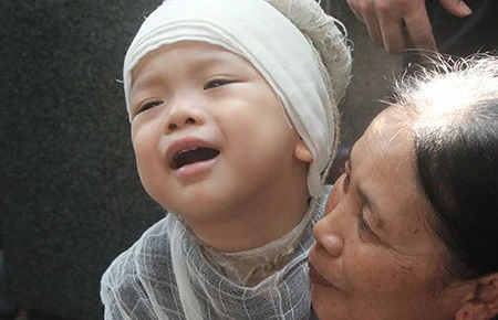 Không ai kềm lòng được khi thấy những đứa trẻ còn say ngủ trên tay người thân. Cháu Lê Quang Long, 22 tháng tuổi, con trai của Thiếu tá Lê Thanh Việt, khi được người thân chít lên vành khăn tang vẫn chưa hiểu rằng cháu sẽ không còn được sưởi từ hơi ấm của cha.