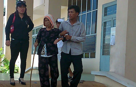 Bà Chính được con trai út (chồng bị cáo) dìu ra sân tòa để dõi theo bóng con dâu. Ảnh: PN