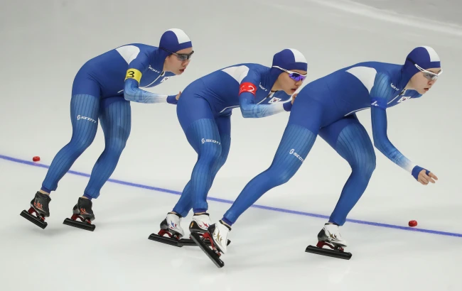 Bộ ba trượt tuyết tốc độ nữ Hàn Quốc, trong đó "nạn nhân" Noh ở vị trí cuối.
