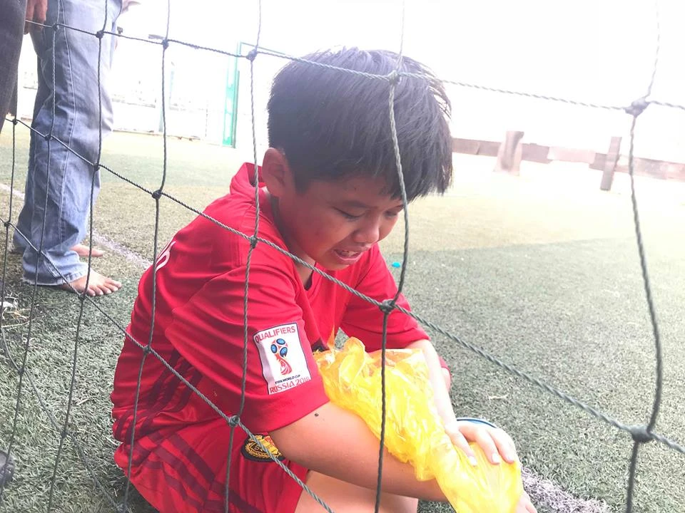 Sau hiệp 1 hòa 1-1, thủ môn lớp 4-10 bị đau tay không thể thi đấu đã rơi nước mắt thật hồn nhiên đầy tiếc rẻ.