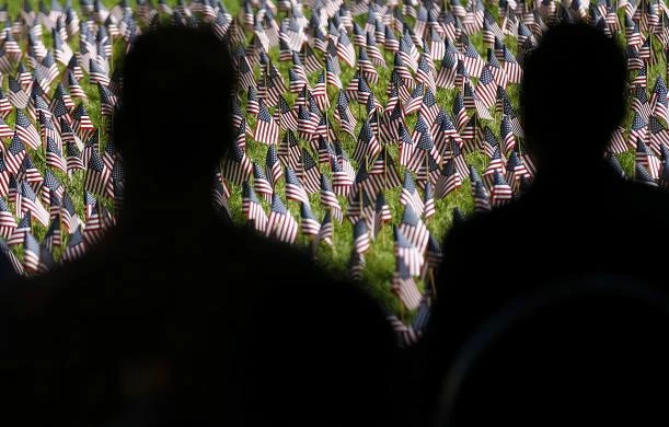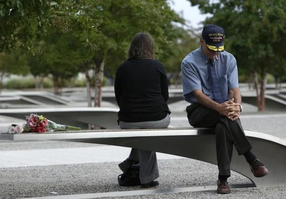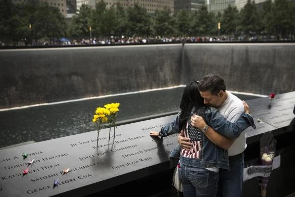 Một người đàn ông và một phụ nữ lặng người nhớ lại người thân của mình trước lễ tưởng niệm những nạn nhân thiệt mạng trong vụ khủng bố 11-9