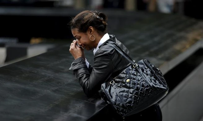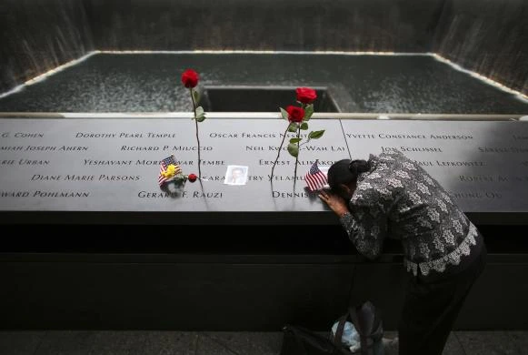 Một người phụ nữ khóc thương bên dòng tên của chồng cô tại bia tưởng niệm các nạn nhân tại NewYork.