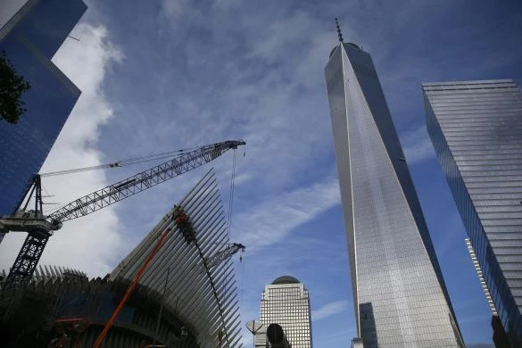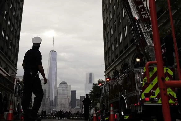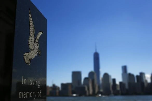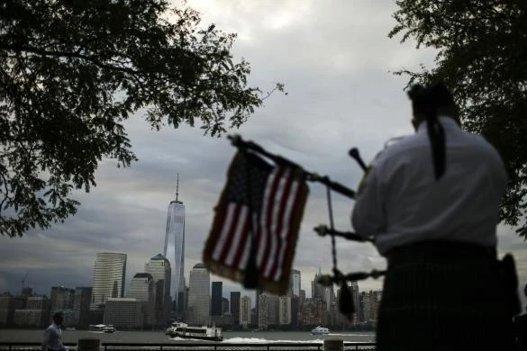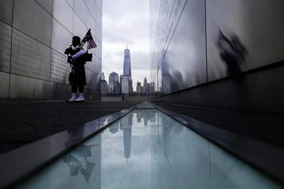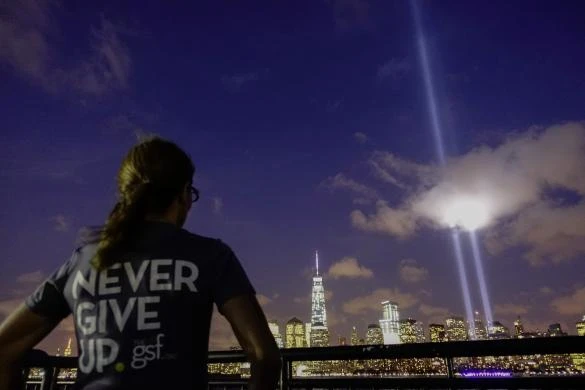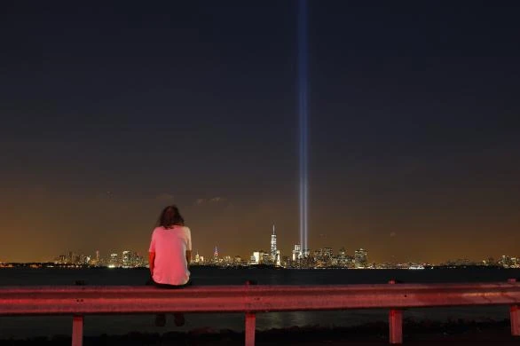 Một người đàn ông ngắm nhìn hai cột sáng xanh nhắc nhở về 2 tòa tháp đôi của Trung tâm Thương mại thế giới bị khủng bố tấn công từ tiểu bang