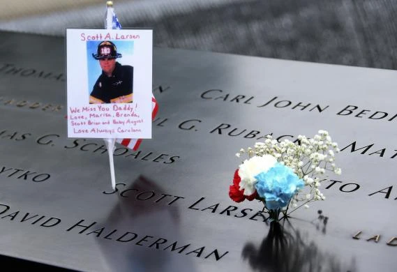Một bức ảnh và lời nhắn cho người Lính cứu hỏa Scott A Larsen cùng một nhành hoa được đặt cạnh tên anh trên bia tưởng niệm.