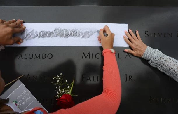 Gia đình của James V. DeBlase tô lại dòng chữ tên anh trên bia tưởng niệm để mang về nhà làm kỹ niệm.
