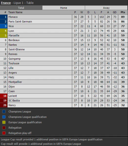 Phải khẳng định điều này là bởi Monaco đang có hiệu số vượt trội so với PSG (+73 so với +56). Khoảng cách 16 bàn thắng là không thể san lấp chỉ sau 1,2 vòng đấu. Đó là chưa kể AS Monaco còn có thành tích đối đầu tốt hơn PSG. Họ thắng lượt đi 3-1 và hòa 1-1 ở lượt về.