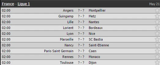 Vòng cuối cùng của giải vô địch quốc gia Pháp sẽ diễn ra cùng lúc 10 trận đấu vào 2 giờ sáng (21-5).