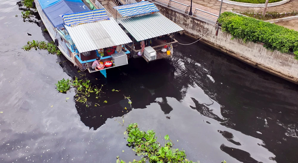Người dân TX Long Mỹ cảm thấy bất an khi nước trên sông cái chuyển màu đen và bố mùi hôi thối. Ảnh: HT