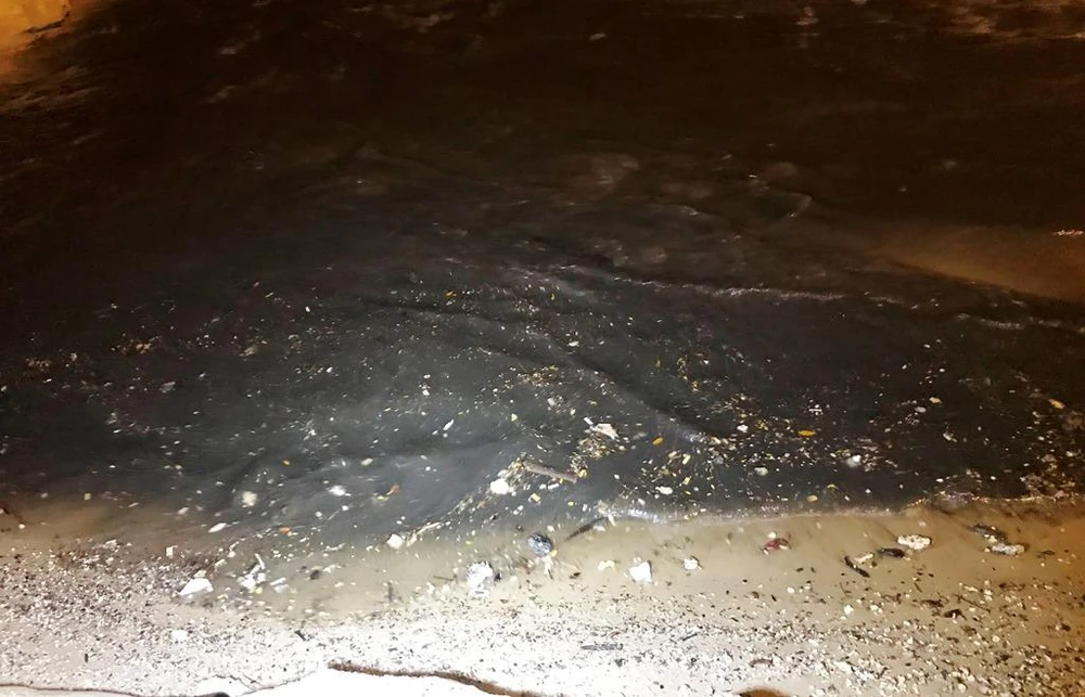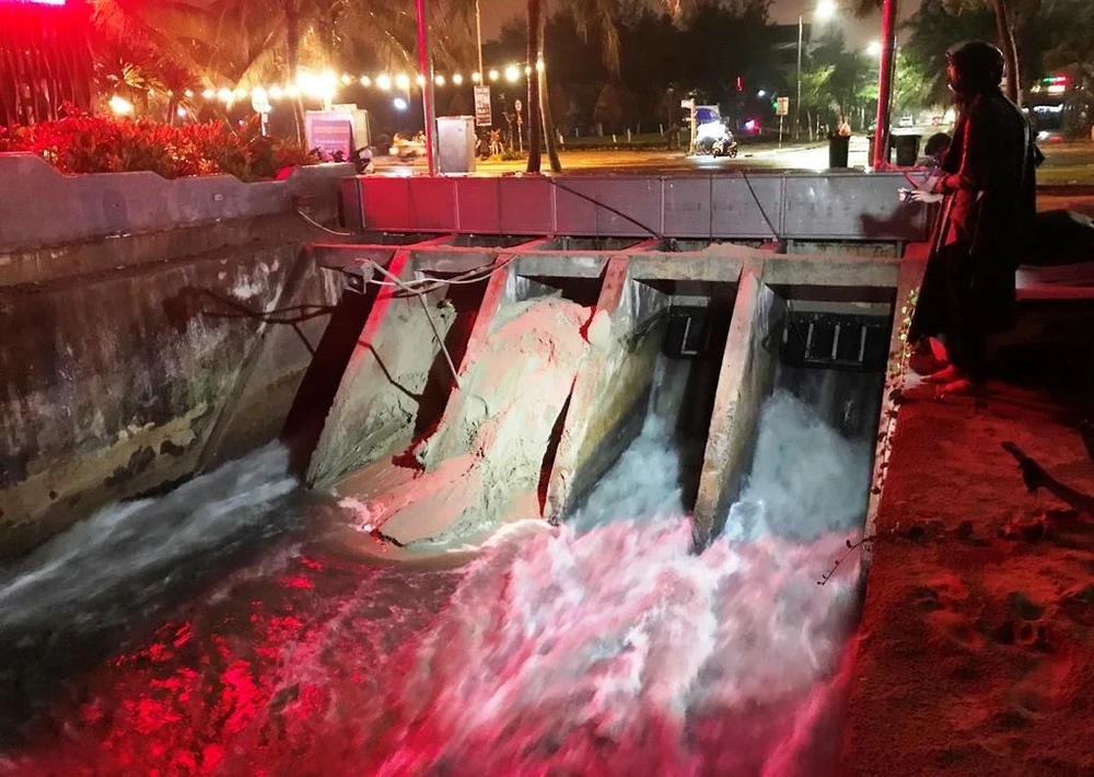 Ghi nhận tại cống xả số 3 (phường Phước Mỹ, quận Sơn Trà) và số 4 (phường Mỹ An, quận Ngũ Hành Sơn) nằm dọc đường Võ Nguyên Giáp, từ đêm đến rạng sáng 29-3, nước thải đen ngòm kèm theo rác cuồn cuộn chảy. Những bao cát chắn nắp cống xả trôi ra biển.