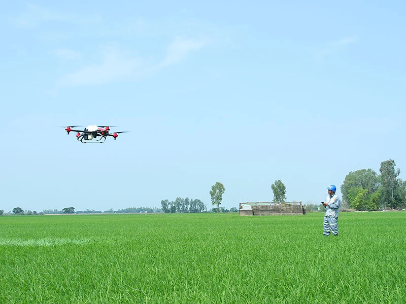 Con đường duy nhất để làm giàu từ nông nghiệp là áp dụng công nghệ cao, công nghệ số. Trong ảnh: Tập đoàn Lộc Trời sử dụng thiết bị không người lái để phun thuốc bảo vệ thực vật trên cánh đồng lúa. Ảnh: TL