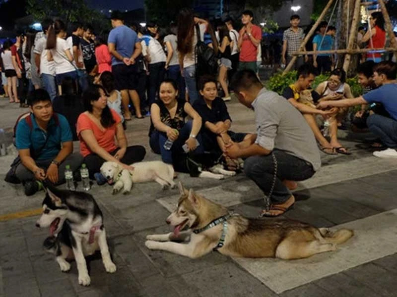 Người dân TP.HCM dắt chó đi chơi ở phố đi bộ Nguyễn Huệ. Ảnh: VIỆT HOA