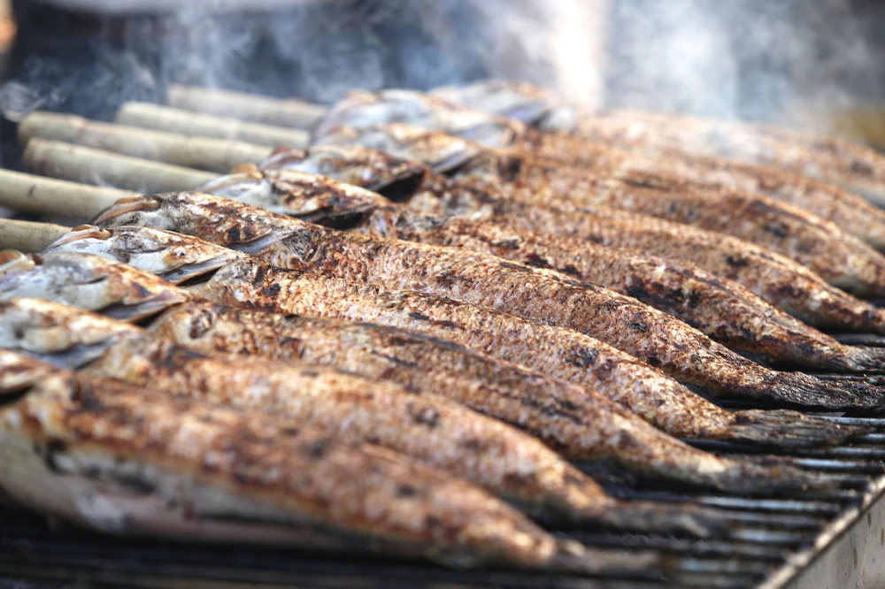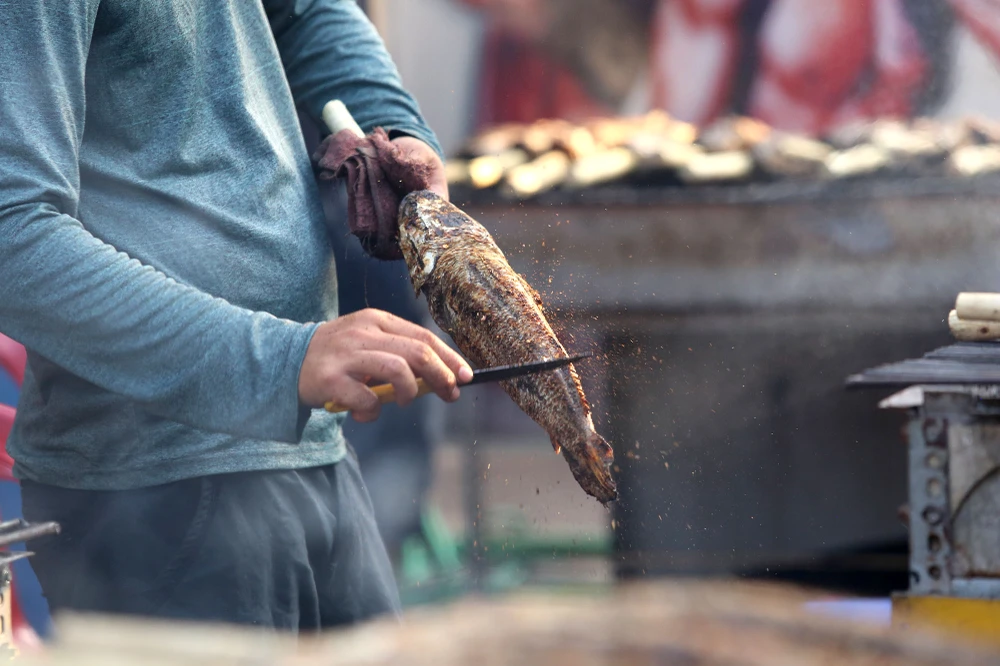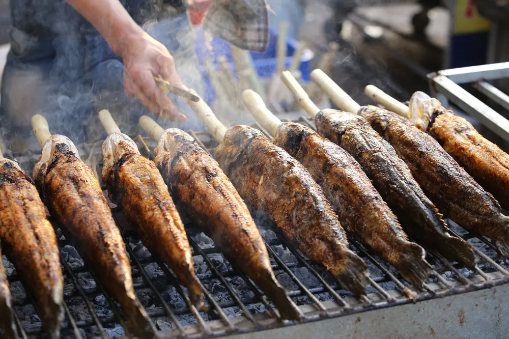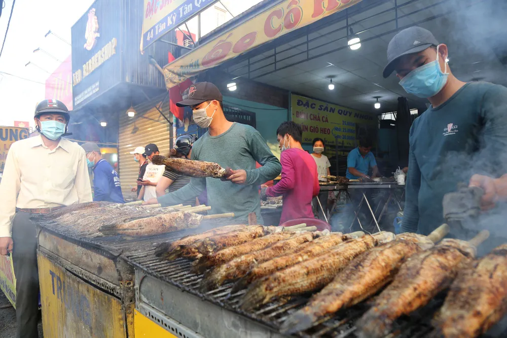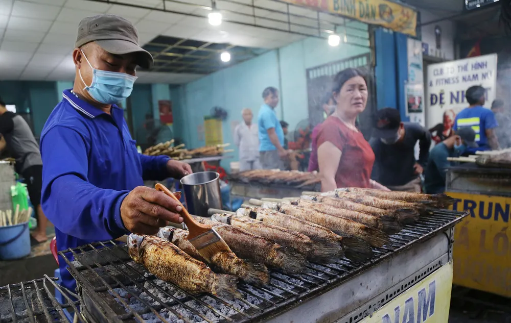 Các cửa hàng tất bật nướng cá phục vụ nhu cầu của người dân.