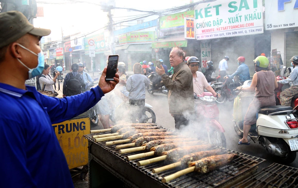 Người nướng, người mua dùng điện thoại phát trực tiếp lên Facebook để chia sẻ với mọi người.