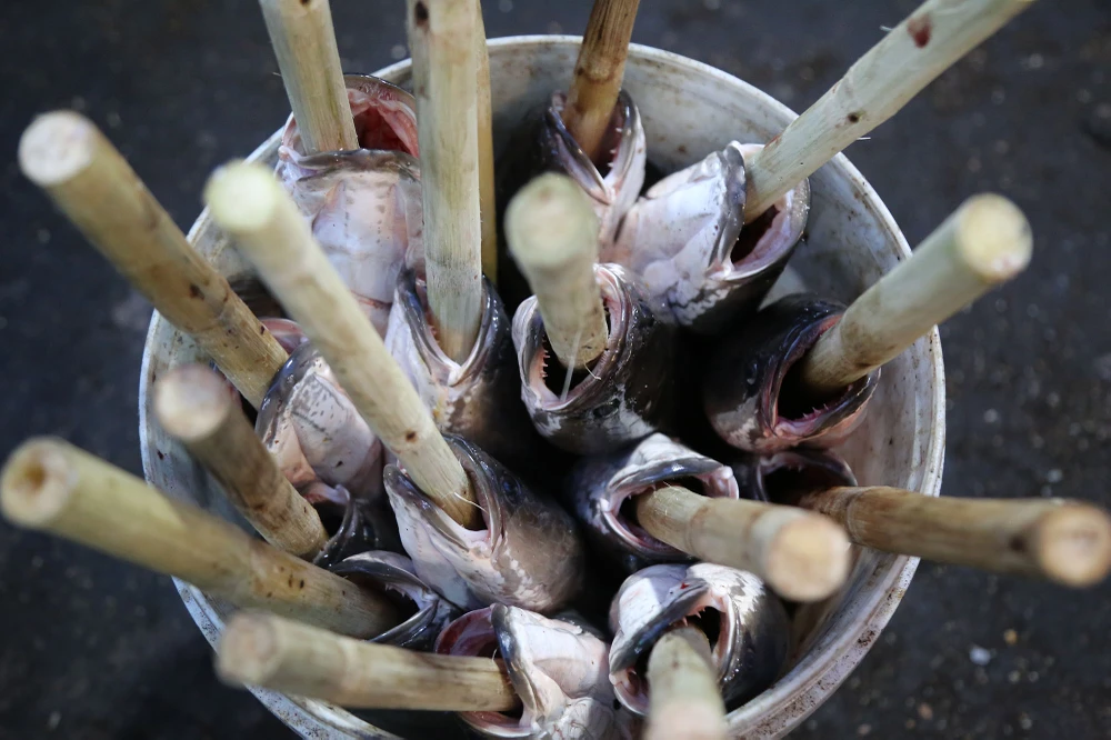 Những con cá lóc được nướng chín vàng, mùi thơm từ cá và mía tỏa khắp đoạn đường.