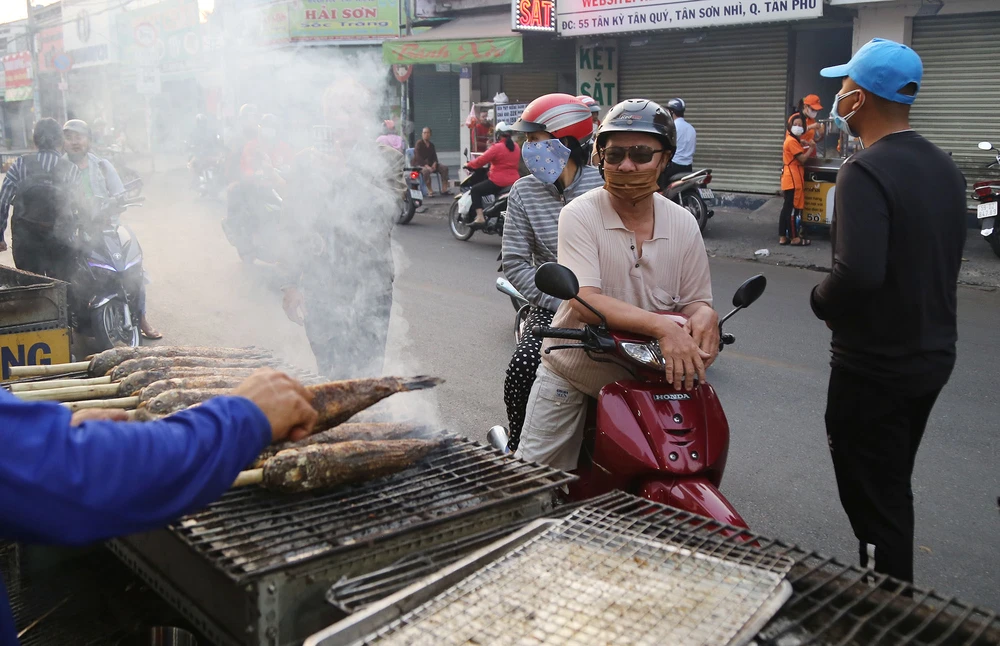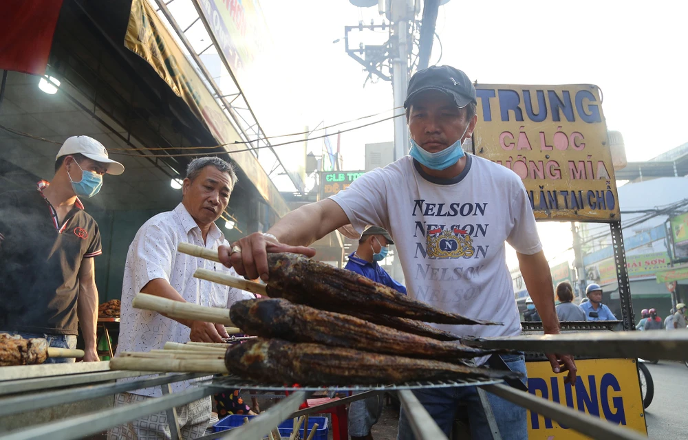 Phố cá lóc nướng trong làn khói nghi ngút của buổi sáng ngày vía Thần Tài.